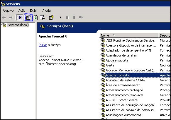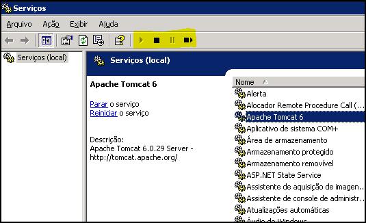 , que são utilizados para “Iniciar ”, “Parar”, “Pausar” ou “Reiniciar” o tomcat quando necessário.