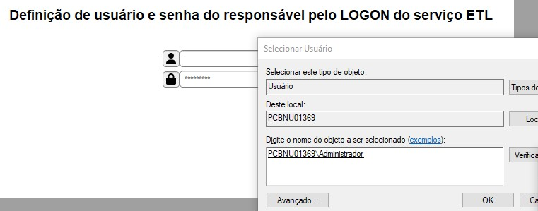 - Após a instalação do serviço é apresenta a tela para definir o usuário e senha. Clicando no ícone, abre a tela de usuários do Windows para selecionar.