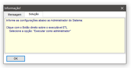 - Execute o arquivo ETL.exe, como administrador, caso não seja executado como administrador irá apresentar a seguinte mensagem:
