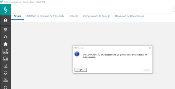No TMSCloud, ao ativar a camada de gestão, o sistema fará o processo automático de atualização do banco de dados do relatório, e quando estiver em processamento, será apresentado uma mensagem para o usuário de aviso.