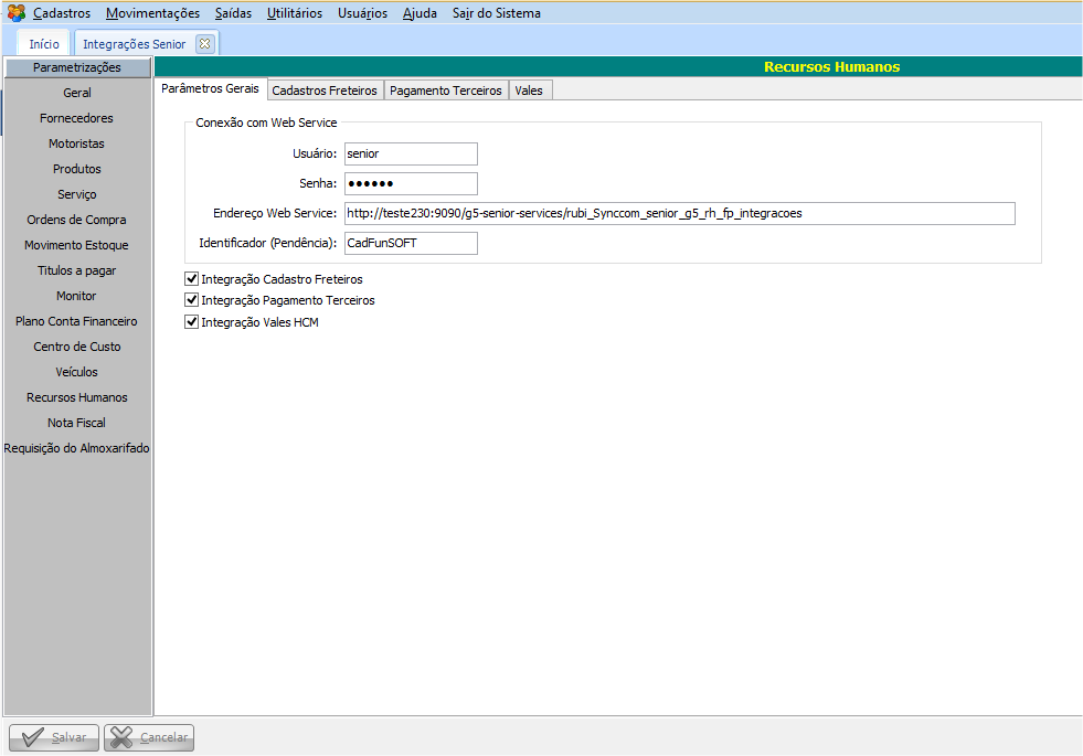 Em CFG > Utilitários > Configurações > Integração Senior, na opção Recursos Humanos > Parâmetros Gerais deverá ser marcada a opção Integração Pagamento Terceiros.