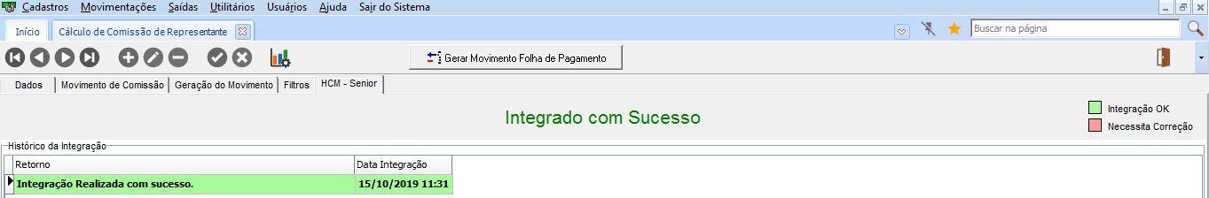 Se a integração ocorrer corretamente ou se houver falha, será apresentado na guia HCM - Senior e a situação da integração.