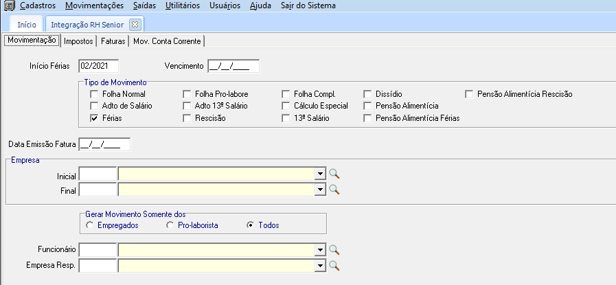 No módulo de FIN | TMS em Utilitários > Integração RH Senior é possível integrar as movimentações da folha ou impostos da folha. Sendo assim, todas as guias e faturas da folha são geradas após o fechamento. Então, o usuário pode acessar o módulo FIN e escolher o lote/período e gerar as faturas normalmente.