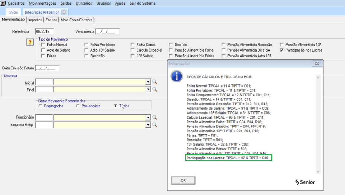 Em FIN > Utilitários > Integração RH Senior, na guia Movimentação marque a opção Participação nos Lucros, assim serão integradas as faturas referentes a essa movimentação.