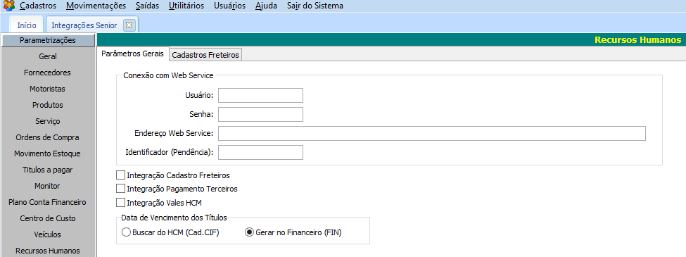 Em CFG > Utilitários > Configurações > Integração Senior, nas configurações do Recursos Humanos, na guia "Parâmetros Gerais", na opção "Data de Vencimento dos Títulos" deverá ser informado com qual data de vencimento serão gerados os títulos da integração, se será com a data de vencimento do Senior HCM ou com a data de vencimento informada no módulo Financeiro no momento da integração.