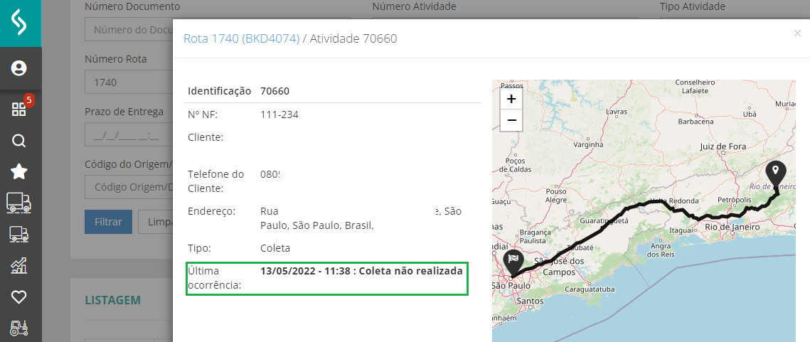 Existe uma coleta cadastrada, porém não tem vínculo ao romaneio e roteirização. Esta coleta apresenta uma atividade cadastrada no RMS: