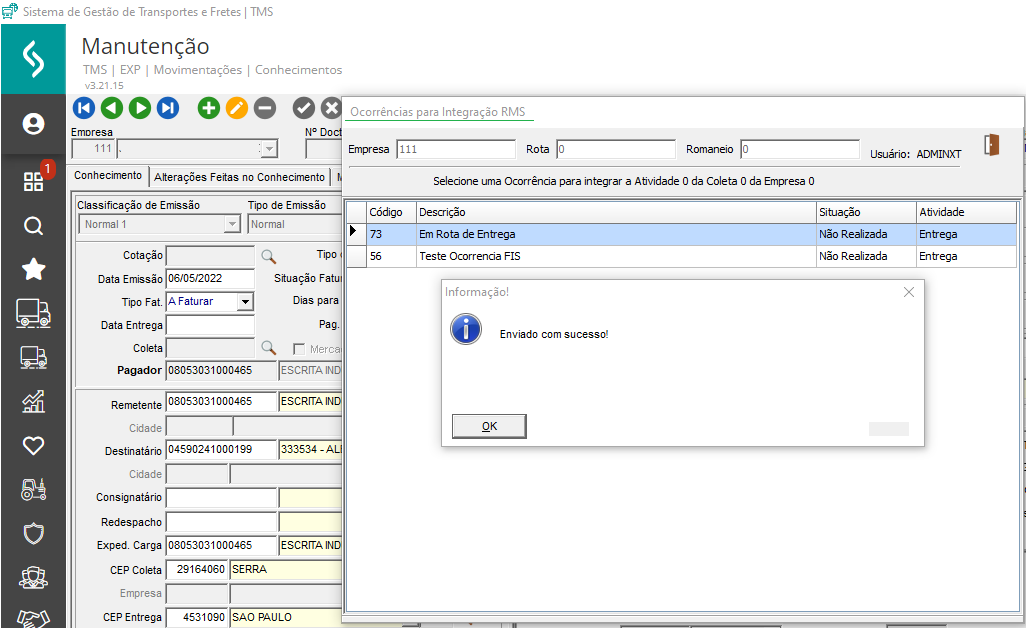 Seguindo os passos do exemplo anterior, quando a configuração de enviar as notas fiscais como atividade no RMS estiver marcada, o sistema realiza a integração da nota corretamente.