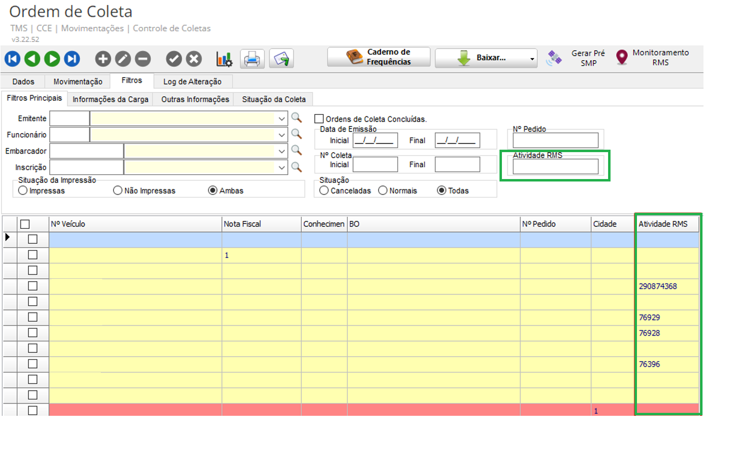 Na guia Filtros, temos o campo Atividades RMS que permite localizar os registros pelo código da atividade RMS e na grade temos também uma coluna Atividades RMS, que apresenta os códigos das coletas já vinculadas ao RMS.