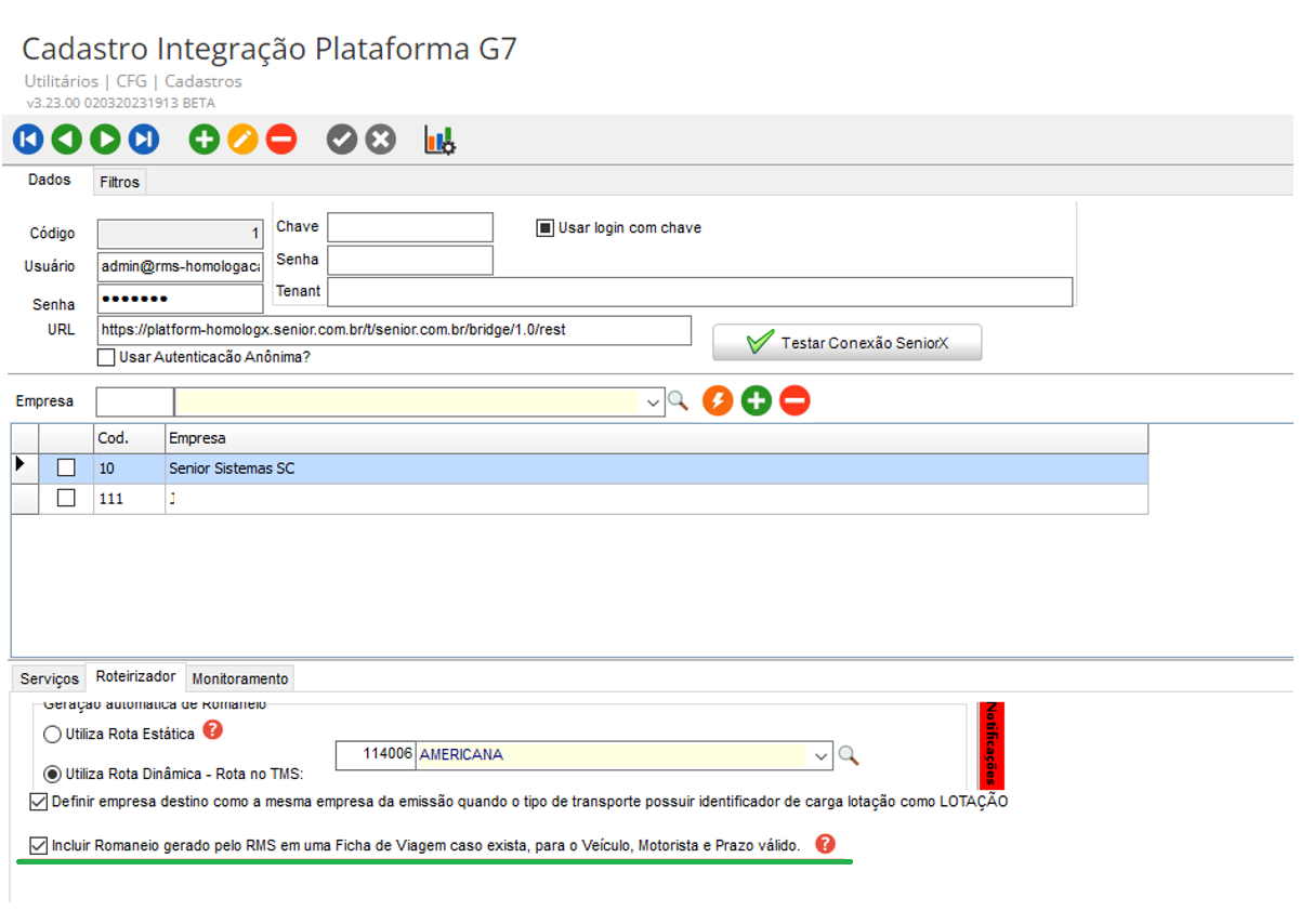 Esta empresa, deve ter o mesmo registro no RMS (Senior X > Otimização Logística > Roteirização e Monitoramento > Definições > Empresas).