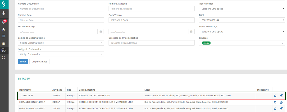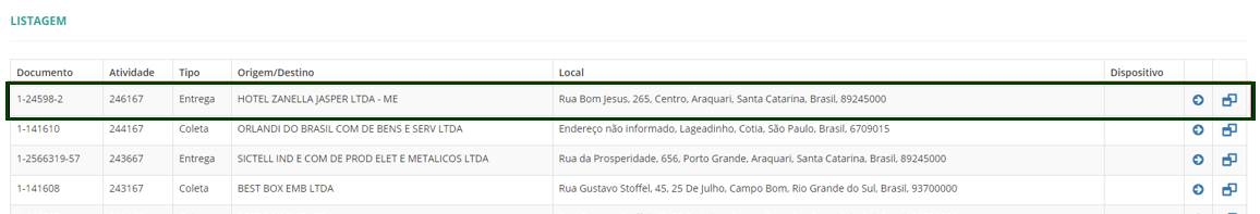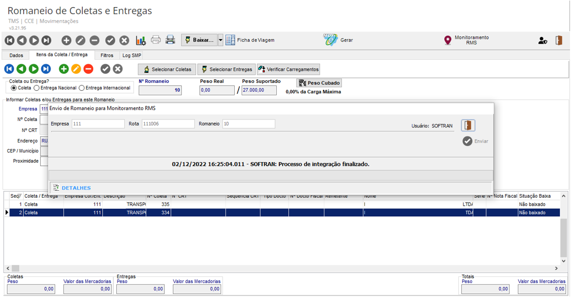 No RMS, em Logística | WMS TMS > Otimização Logística > Roteirização e Monitoramento > Atividades > Entregas coletas e serviços, consultar os registros, o sistema apresenta a coleta que foi cadastrada anteriormente, pois através do serviço de envio/consulta serão integrados automaticamente.