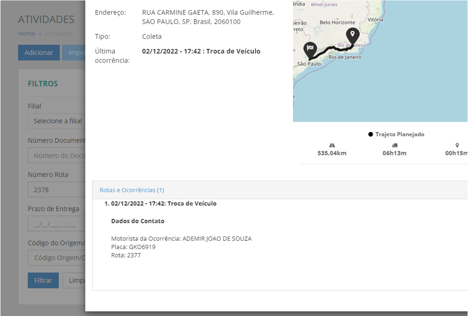 Ao verificar as ocorrências, o sistema registra os dados do veículo/motorista e rota de onde veio os dados adicionados por último.