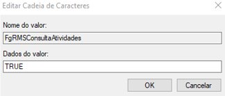 Realizado esses primeiros passos, abra o abrir o editor de registro regedit, e execute o RBT com a variável FgRMSEnvioAtividades como TRUE (botão direito > Modificar).