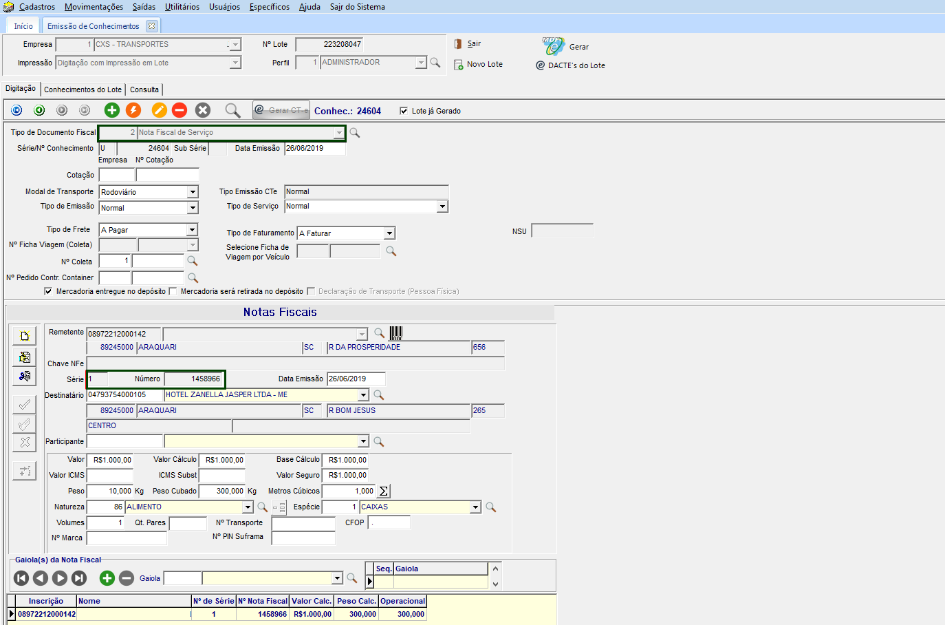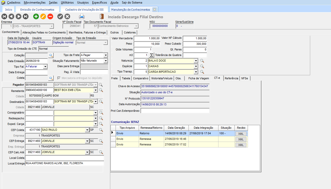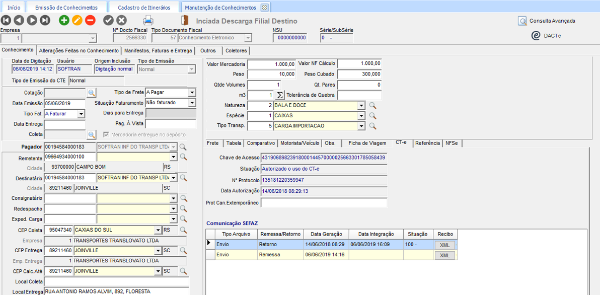 No módulo EXP, em Movimentações > Conhecimentos > Emissão, cadastrar um novo conhecimento. Como regra, este conhecimento precisa que a empresa origem seja igual a empresa de destino. Imprimir o CT-e para gerar a chave de acesso do documento.