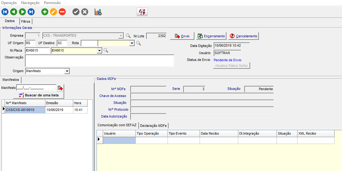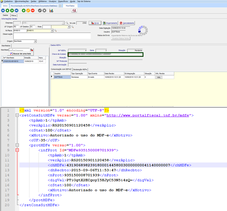 Clicar no botão Envio para gerar a chave de acesso. Esta chave será registrada no arquivo de retorno do MDFe para ser autorizado, que será salvo na mesma pasta onde foi configurado no cadastro de empresas em CFG> Cadastros > empresas e fornecedores > Expedição > MDFe > Diretórios