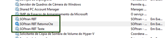 Nas configurações de serviços, abrir duas telas e iniciar o serviço separadamente (SOFtran RBT e SOFtran RBT Teste).