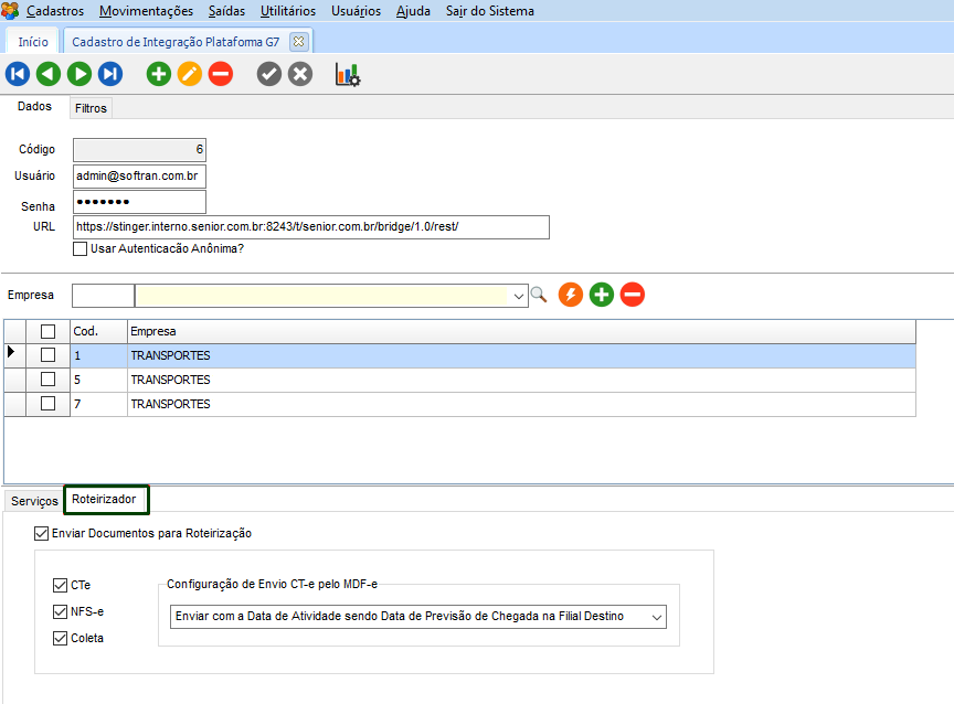 No módulo CFG, em Cadastros > Cadastro Integração Plataforma G7, ter a configuração da empresa para acessar a Roteirização.