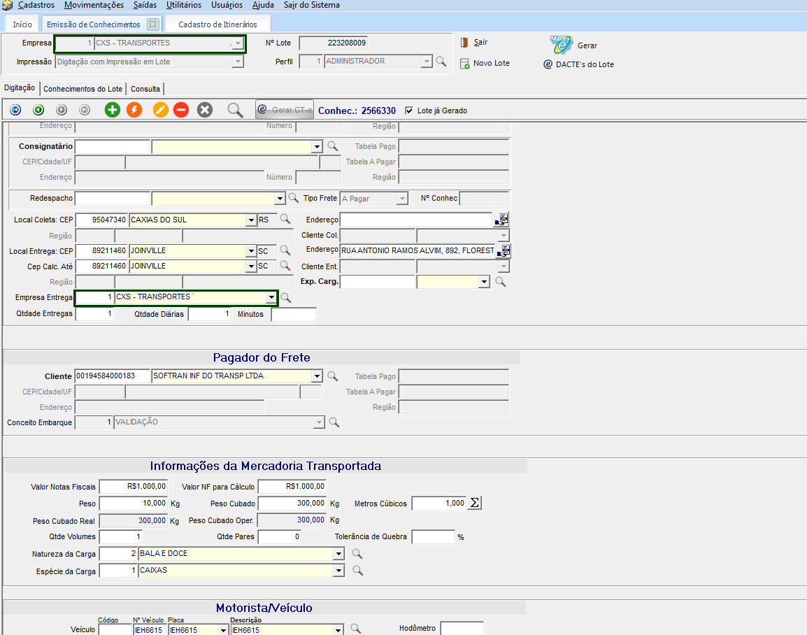 No módulo EXP, em Movimentações > MDF-e (Manifesto Eletrônico) ou pela tela de Emissão de Conhecimentos, será gerado um novo MDF-e. Neste exemplo, será feito pela tela de emissão de conhecimento, com um novo conhecimento cadastrado, lembrando que este conhecimento precisa ser tipo de transporte de Carga Fechada, e ter as informações do veículo e motorista preenchidos. Depois disso, clicar no botão Gerar.