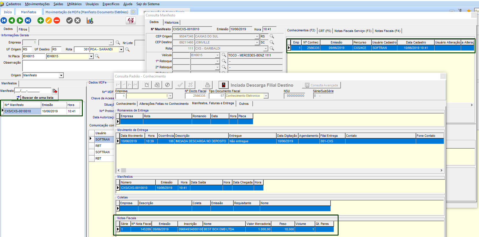 De acordo com o exemplo anterior, realizado a autorização do MDF-e e com a configuração de entrega das notas fiscais como atividade no RMS, foi registrado a integração com a nota fiscal vinculada ao conhecimento do manifesto.