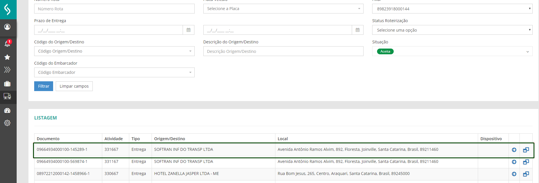 No manifesto operacional vinculado, como regra, o sistema verifica a rota informada se a mesma pertence a mesma empresa de origem e destino.