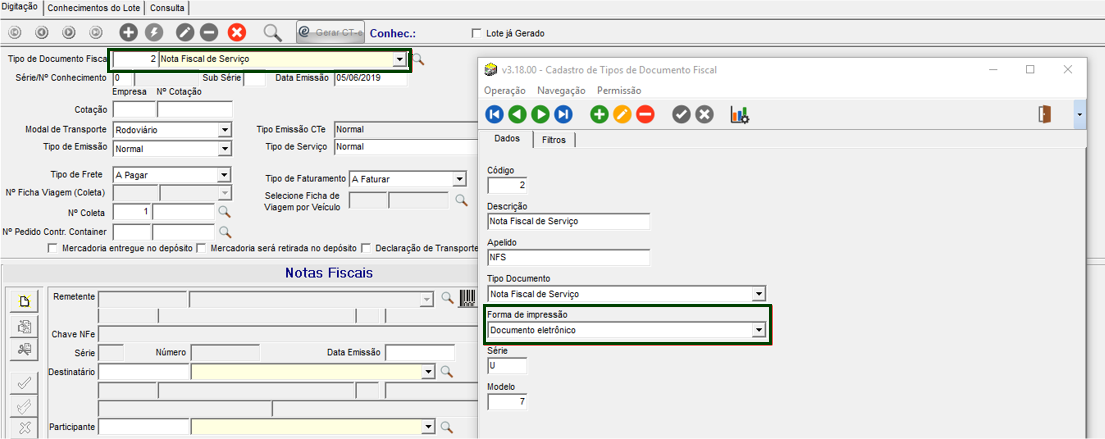 No módulo EXP, em Movimentações > Conhecimentos > Emissão, cadastrado um novo registro com o tipo de documento igual a Nota Fiscal de Serviço. Este documento precisa ter a forma de impressão como documento eletrônico.