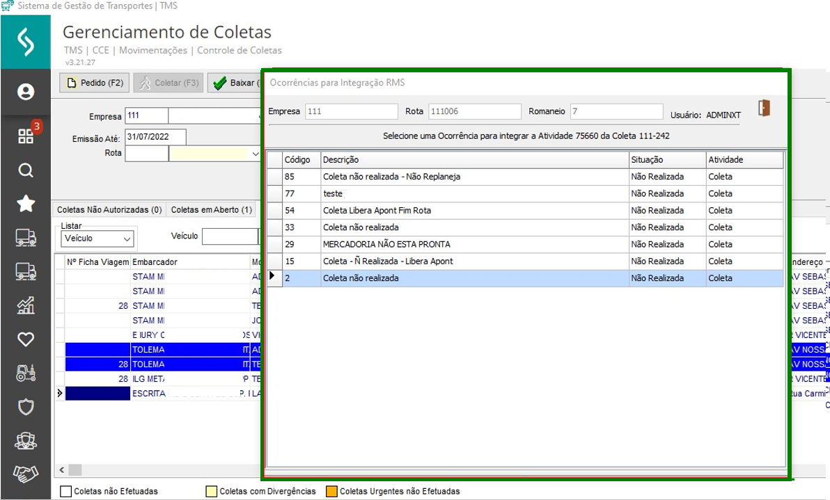 Na tela de cadastro da coleta, realizado o cancelamento. Será aberto a tela com a ocorrência de cancelado, que ficará registrado na rota do RMS também.