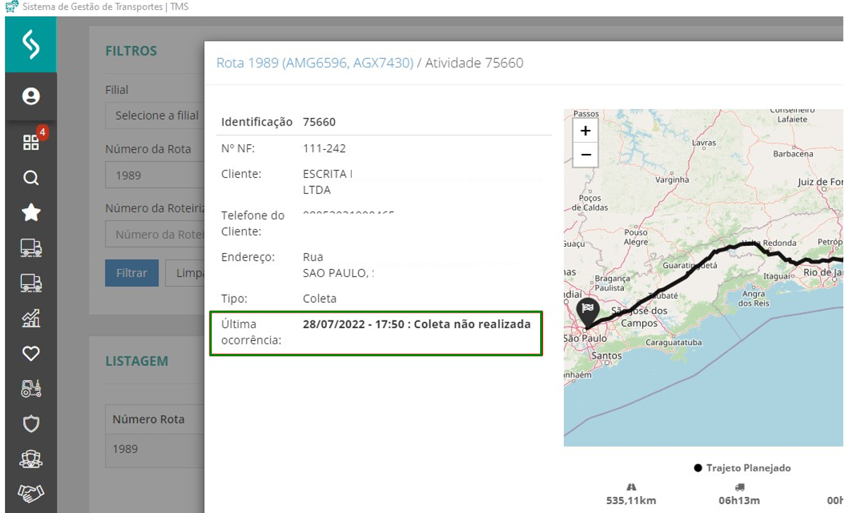 A mesma ocorrência selecionada é registrada na rota vinculada ao RMS.