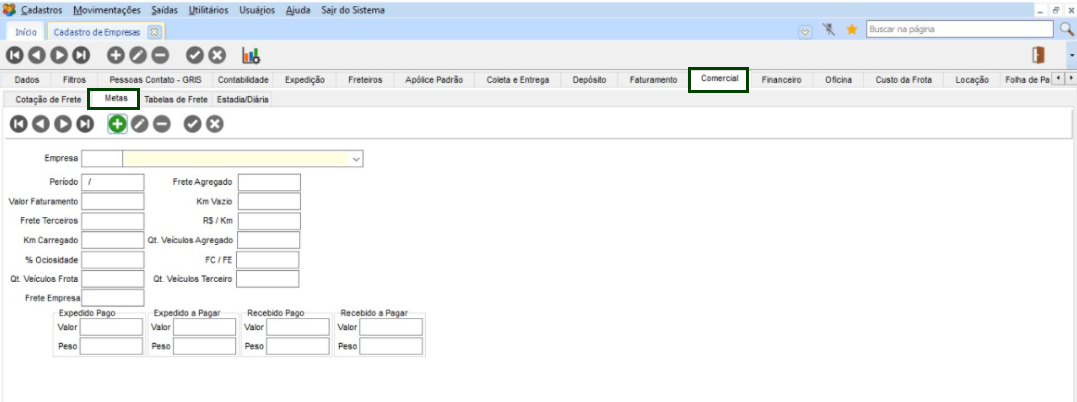 O Cadastro de Metas, em Cadastro de Empresas > Comercial > Metas, tem por objetivo ser o conjunto de metas de cada unidade/filial de uma transportadora bem como registrar alguns custos padrões que o sistema.