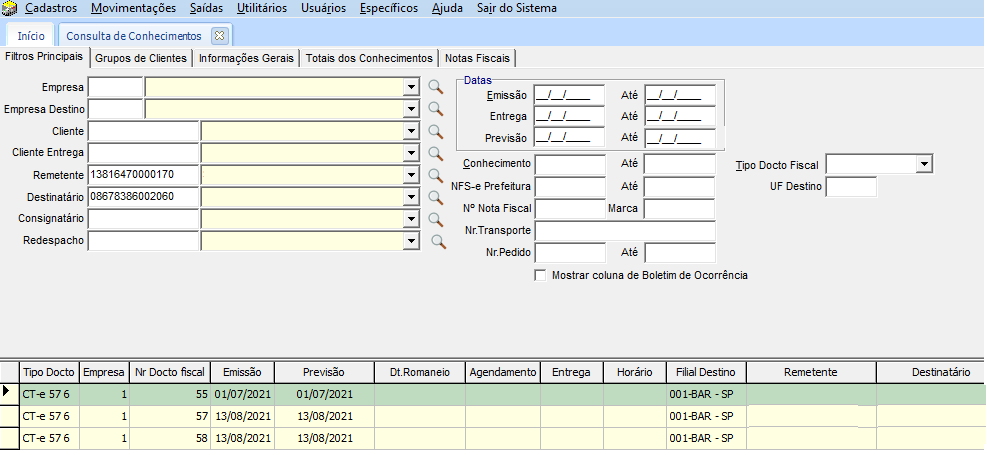 - em Registros o campo Documento selecionar opção CTe;