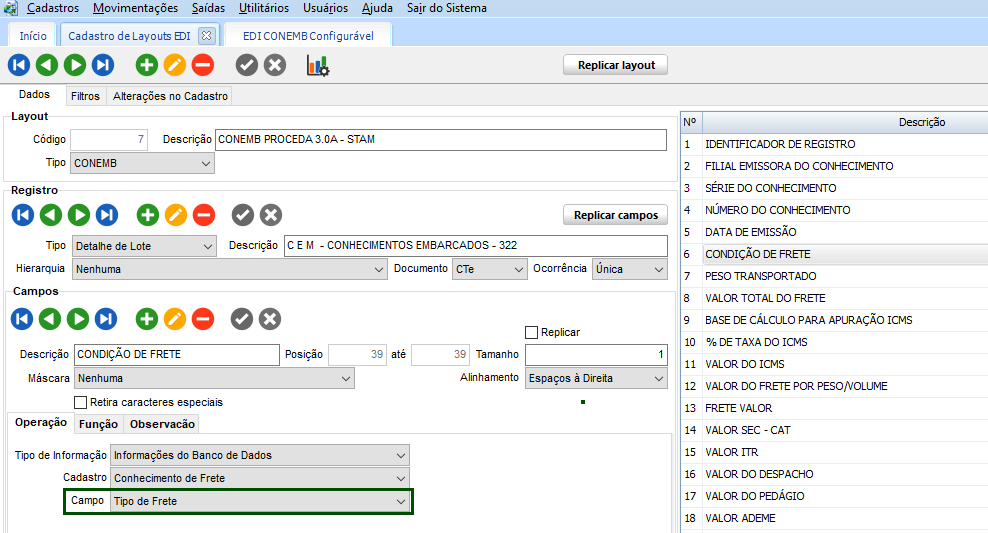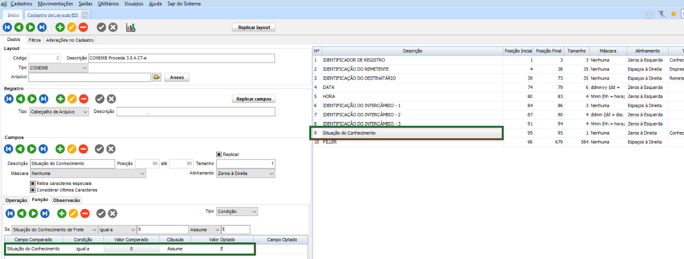 Neste quadro também é possível informar no campo Campo como Situação do Conhecimentoquando o tipo for Conhecimento de Frete para visualização da exportação de EDI incluindo a situação dos registros de CT-e que foram cancelados, onde os ajustes necessários estarão disponíveis a serem configurados na guia Função. Para isto utilize o EDI em versão 3.22.00 ou superior. Sendo assim, para que seja utilizado essa opção é necessário que no menu EDI – Cadastro de Embarcadores a configuração de Exportar Documentos Cancelados esteja habilitada.