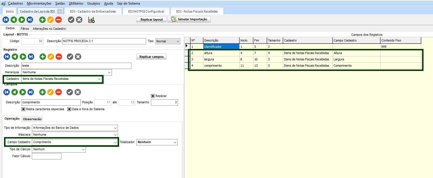 Para importar notas fiscais com informação de metros cúbicos informado no arquivo de importação EDI sendo possível configurar layout na rotina de cadastro de Layout EDI conforme o embarcador, estar utilizando a informação do banco de dados altura, comprimento e largura quando o cadastro for do tipo Notas Fiscais Recebidas.