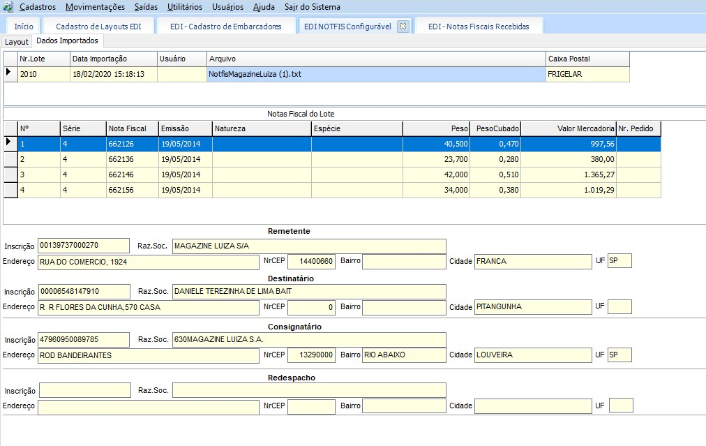 - Após ler e carregar as informações do arquivo, apresenta os lotes e suas respectivas notas fiscais.