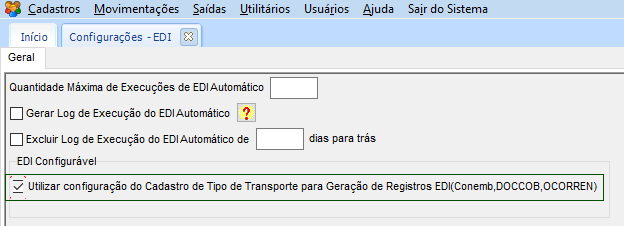 No módulo CFG, em Utilitários > Configurações > TMS > EDI – Intercâmbio Eletrônico de Dados, na opção EDI Configurável, fica a configuração: Utilizar configuração do Cadastro de Tipo de Transporte para a Geração dos Registros EDI (Conemb, DOCCOB, OCORREN):