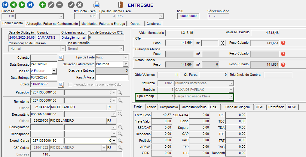 Após verifique o conhecimento que será exportado e qual Tipo de Transporte está configurado para este CT-e.