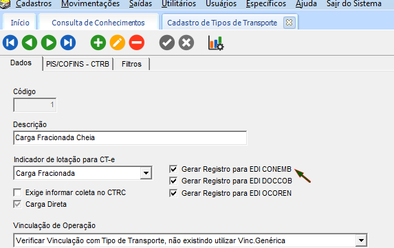 No módulo EXP em Cadastros > Cadastros Gerais > Tipos de Transporte, verifique o cadastro e desmarque a opção para gerar registro para EDI. Neste exemplo, a opção EDI CONEMB está desmarcada.