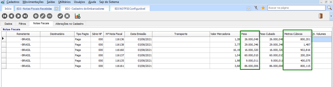 Em Utilitários > EDI NOTFIS Configurável, após realizado a importação de um arquivo. Quando a configuração estiver desmarcada, ao verificar as notas importadas, todas estarão com os valores de Peso e Metros Cúbicos.