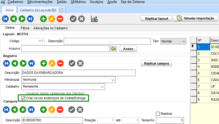 Nesse grupo se cadastra os registros que serão lidos e importados, sendo obrigatório a descrição do registro e a indicação do campo Cadastro.