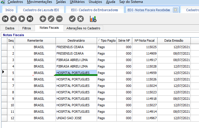Em Movimentações > Notas Fiscais Recebidas, no lote importado será visualizado na guia Notas Fiscais