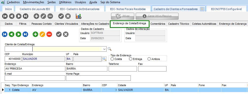 De acordo com a configuração, quando marcada a opção e realizado a importação do arquivo, além de atualizar os registros já existentes, o sistema irá criar novos endereços que ainda não foram importados, na guia Endereço Coleta/Entrega, do Cadastro de Clientes e Fornecedores.