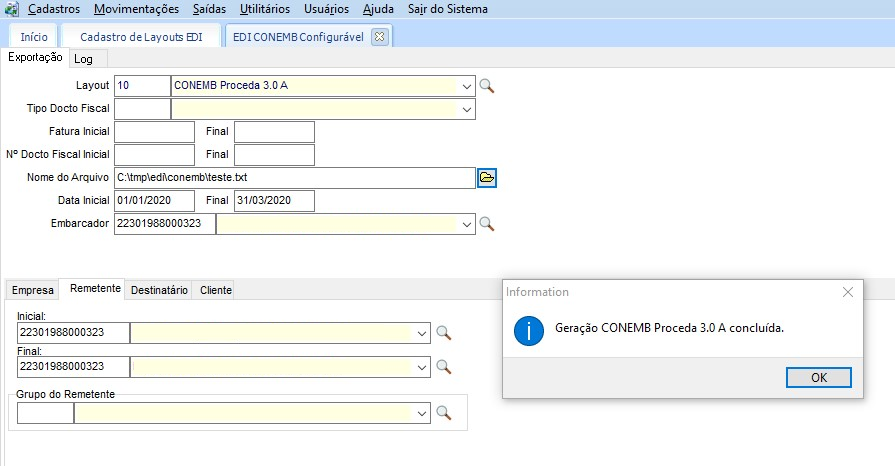 Marcada a configuração no cadastro de leiautes. Em Utilitários > EDI CONEMB Configurável, gerar o arquivo para um período, selecionando o mesmo layout configurado anteriormente.