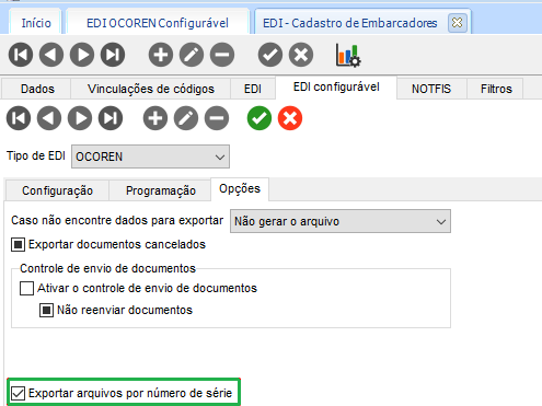 Após executar as atualizações necessárias, em EDI > Cadastros > Embarcadores > EDI Configurável, quando o embarcador tiver o Tipo de EDI equivalente ao OCOREN. Na guia Opções, marque o parâmetro Exportar arquivos por número de série.