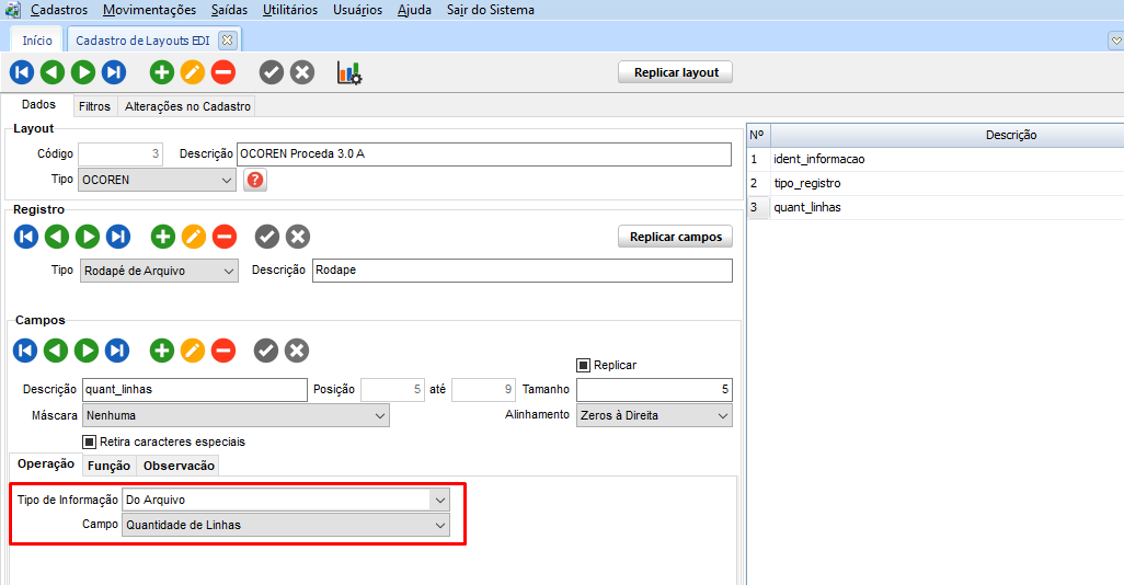 Para exportar a Quantidade de Linhas do Arquivo EDI, acesse o módulo EDI em Cadastros > Layout EDI Configurável > Exportação, quando selecionado o campo Tipo de Informação = Do Arquivo, foi adicionado o campo Quantidade de Linhas.