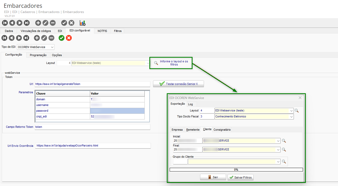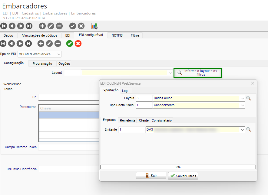 - Ao clicar no botão Informe o layout e os filtros, será apresentada a tela EDI OCOREN WebService, para que sejam informados os dados do layout e as informações de Empresa/Remetente/Cliente/Consignatário: