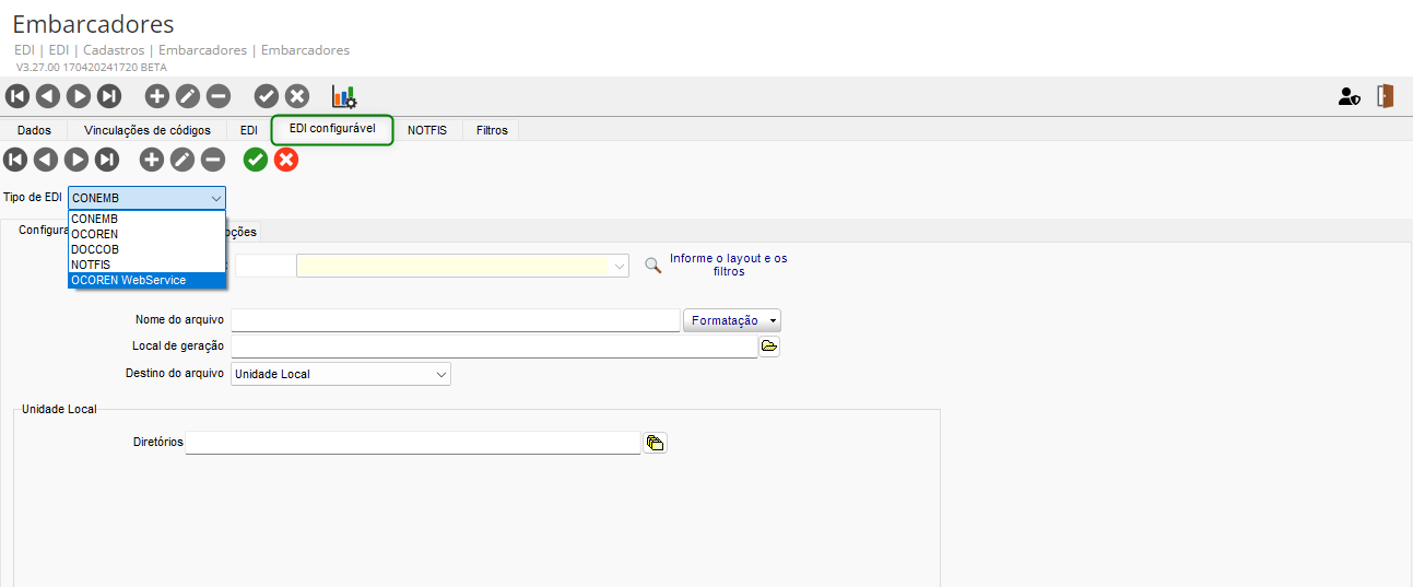 Foi criado um novo cadastro de layout EDI configurável para Webservices. Na tela de cadastro de embarcadores, na guia EDI Configurável, foi adicionado um novo tipo de EDI denominado Ocoren Webservice. Essa tela permite configurar os parâmetros de conexão com o Webservice e o layout previamente configurado.