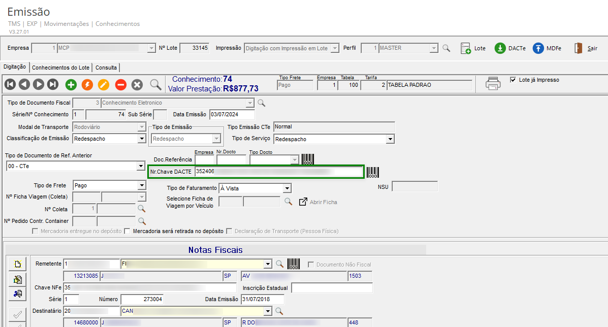 No documento de CT-e do tipo Redespacho, o sistema verificará a chave de origem informada.