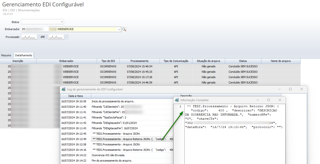 Na guia Detalhamento, o log de processamento é exibido. Para visualizar os dados completos, efetue um duplo clique na linha desejada: