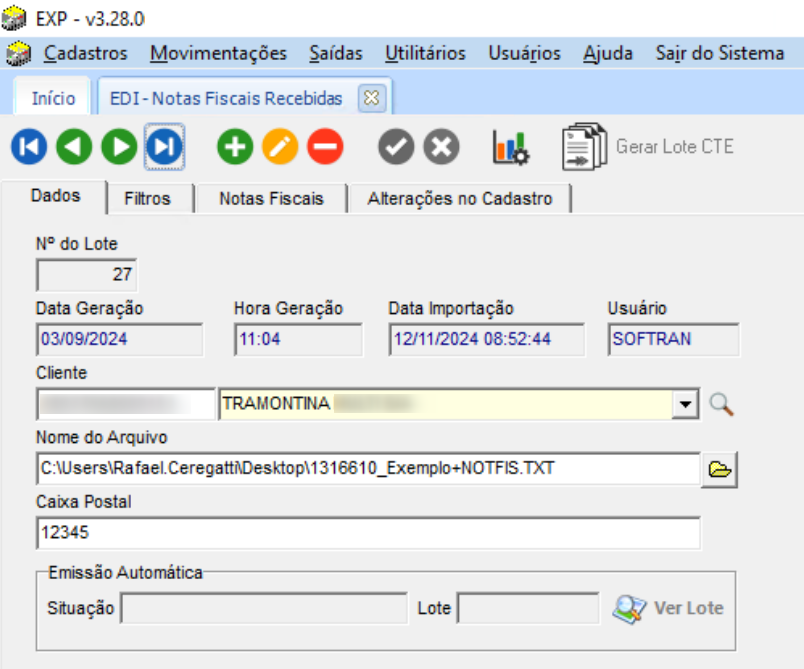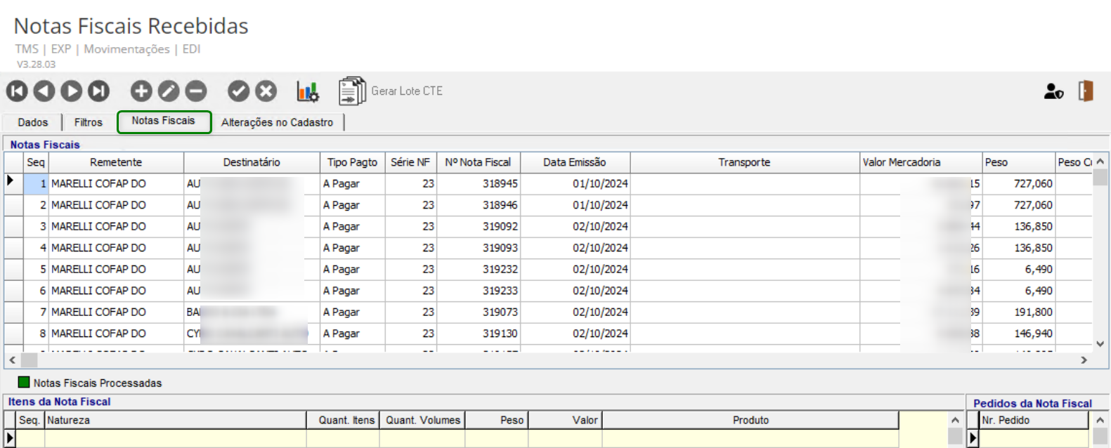 Para Consultar o Lote, vá até Expedição > Movimentações > EDI > Notas Fiscais Recebidas. Na guia Notas Fiscais, serão exibidas todas as notas fiscais importadas: