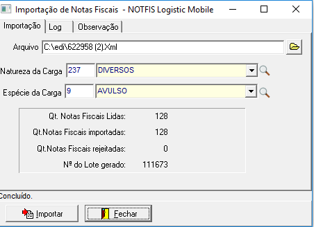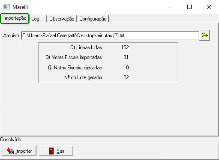 - Quantidade de Notas Fiscais Importadas