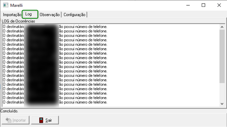 - Na guia Log serão exibidos os dados que precisam ser ajustados: