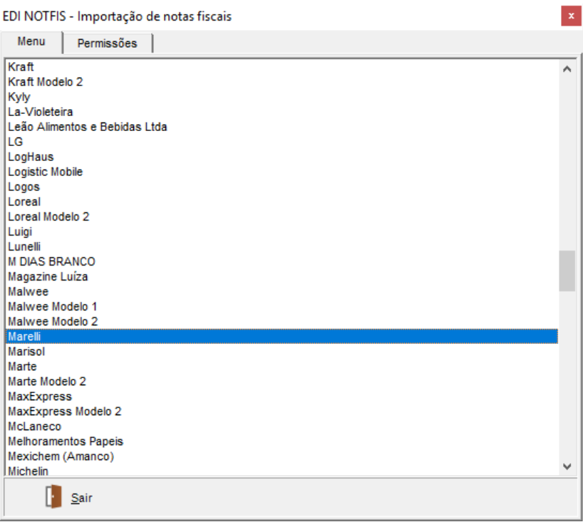 Para realizar a importação das Notas Fiscais via arquivo de importação padrão, acesse o módulo EXP em Movimentações > EDI > Importação de Notas Fiscais > Marelli e selecione o arquivo de importação: