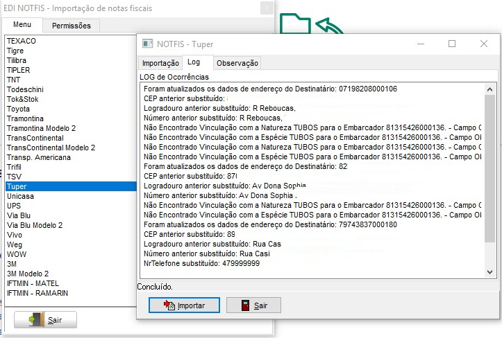 No módulo EDI, em Movimentações > Importação de Notas Fiscais > Tuper, marque a opção Atualizar Dados Cadastrais dos Clientes – Registro 31. Na guia Log apresenta as informações geradas com as alterações geradas no endereço dos clientes.